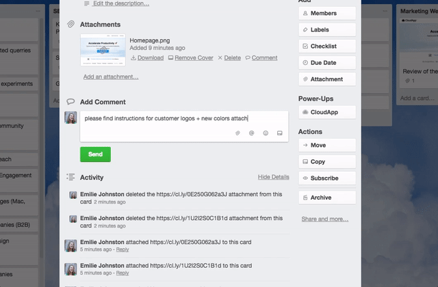 The CloudApp Power-Up for Trello was built to make it easier to give clear context to team members so that you could tell someone once, and they’d understand and get to fixing. No product walkthrough meetings, no “hey what page was this from?’, just one bug report that’s easy to follow, and you’re done. With visuals like screen recordings, GIFS, and screenshots you can immediately share your perspective with your team, whether they are sitting next to you or across the globe.